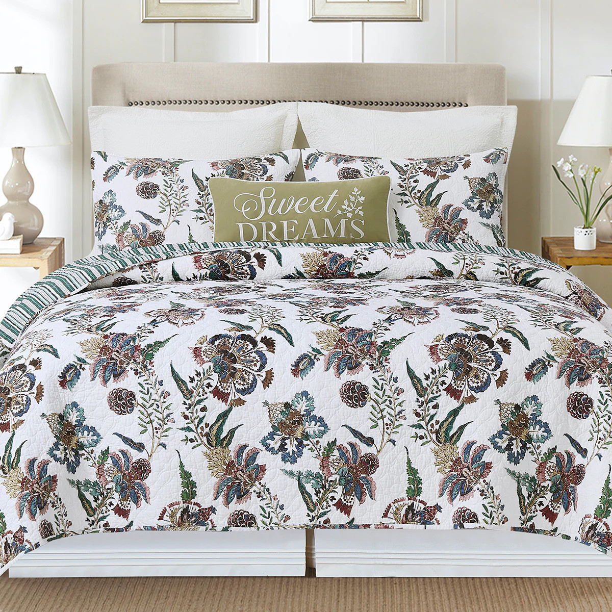 Loading... Please wait...Bring enduring style to any bedroom with the C&F Home Braelyn Quilt Set. Featuring a traditional Jacobean botanical vine design in shades of green, blue, maroon, and tan, this quilt exudes classic sophistication. The flagship stitching pattern enhances the timeless aesthetic, making it a standout piece for curated bedroom collections. For versatile styling, the quilt reverses to a coordinating stripe pattern with alternating lines of dots, markings, and solid lines in matching colors, offering two complementary looks in one. Perfect for curating traditional, transitional, or nature-inspired collections, Braelyn combines classic artistry with functional elegance.