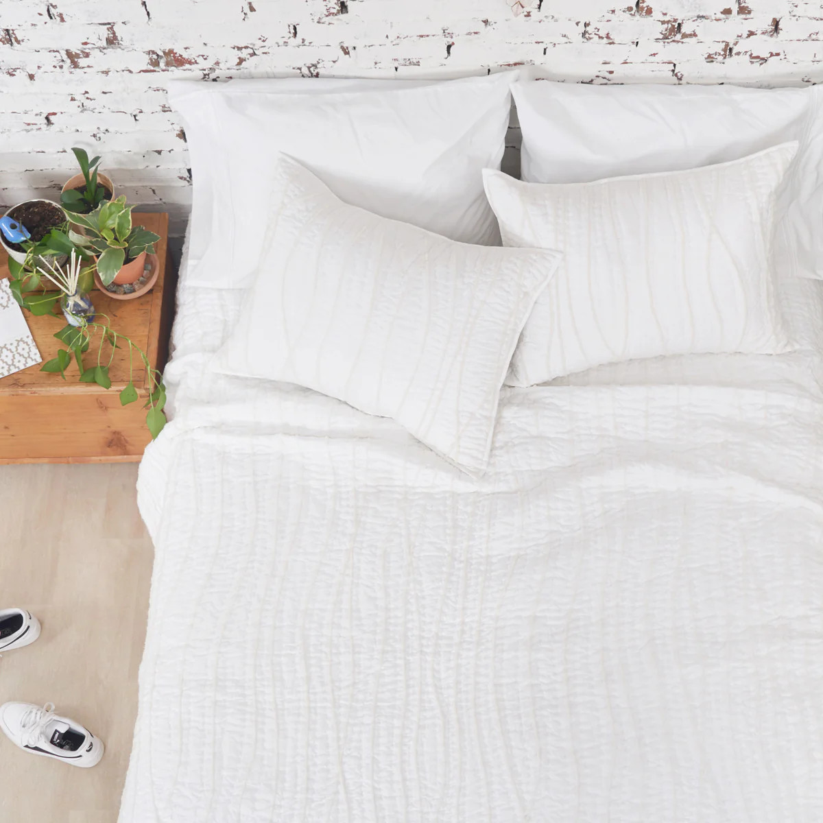 The carol & frank Nihanna Quilt Set offers serene sophistication with its tufted wave design on crisp white fabric, creating a soothing, artful texture. Hand-quilted details and loop embroidery tufting add an artisan touch, blending timeless craftsmanship with modern refinement. Lightweight yet cozy, this all-season essential is a statement in understated luxury.