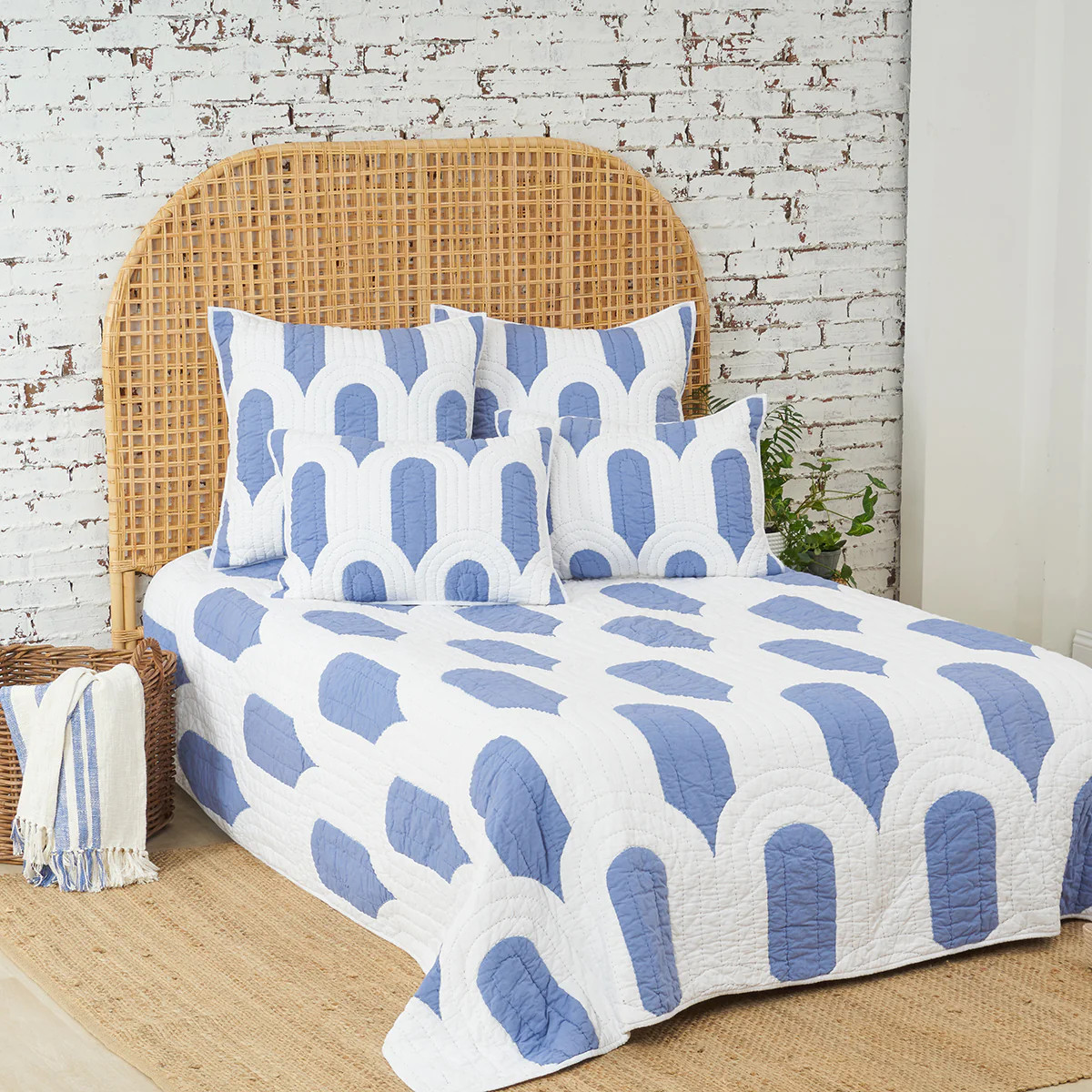 The carol & frank Phoebus quilt brings modern art deco vibes right to your bedroom. Its unique geometric pattern of white and denim overlapping arcs is complemented by precise applique and embroidery work. Crafted from 100% cotton, with indigo stitching and matching envelope shams with ties, this quilt will upgrade any bedroom to a stylish, sophisticated space.