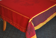 Our Jacquard Teflon collection is 100% double woven cotton (it is crossing two sets of threads over and under each other) so the pattern is woven in the fabric instead of being printed on it. The tablecloths have a Teflon finish that makes them stain proof while preserving the feel of cotton!  The beautiful multi color French Tablecloths will dress your table for those special occasions while eliminating any worry about spills. Spills can just be wiped off with a damp cloth, but if they don't disappear initially, they will go away when washing your tablecloth - even in cold water.