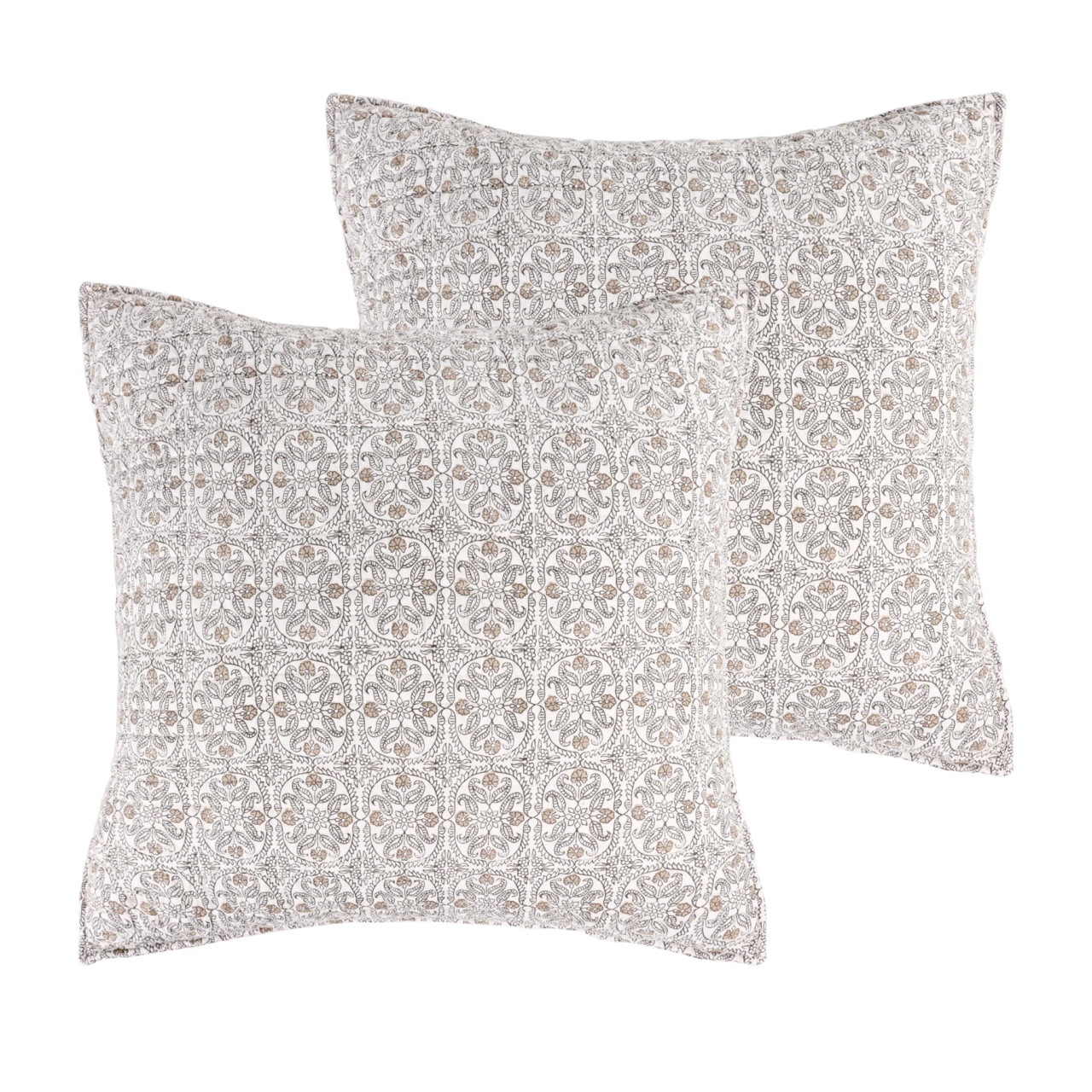 The Adare Quilted Euro Sham by Levtex Home is inspired by distinctive fashionable wall coverings. Offered in two color schemes to choose from, blue, with navy and white and taupe with grey and cream, this design will immediately transform your bedroom. These shams feature beautiful flowers in bloom and vines with a distinctive border all around. The Euro Sham (26x26in.) is cotton front and back, quilted with a cotton rich filler and is machine washable. Pillow inner not included. Enjoy this for years to come!