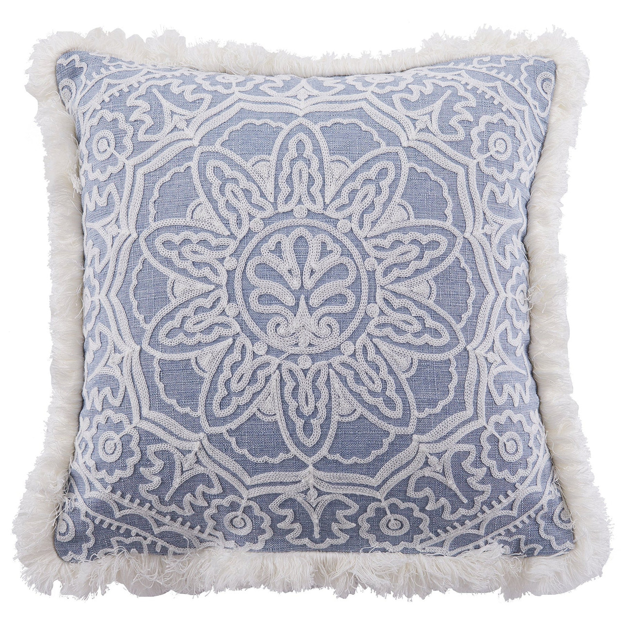The Medallion decorative pillow matches perfectly with the Levtex Home Bennett bedding collection. This pillow is sized at 18 x 18in. and features a large embroidered medallion in white on a textured blue ground surrounded with a white cotton fringe edge. The color palette makes this a versatile accessory for your bed, couch or favorite chair. The pillow comes pre-filled with a soft. luxurious feather inner.