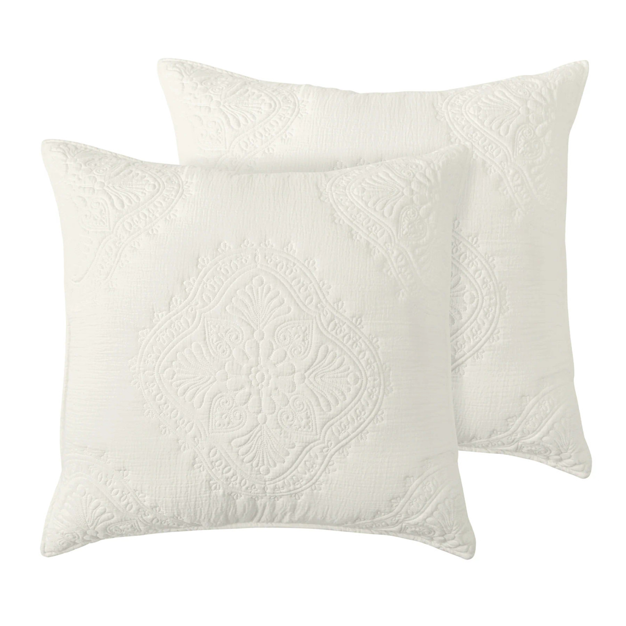 The Muslin Stitch Quilted Euro Sham Set by Levtex Home is inspired by antique woven fabrics and cloths. Offered in three fashionable colors, white, taupe, cream, this design will immediately transform your bedroom. These shams feature beautifully stitched medallions on a soft muslin. The Euro Sham (26x26in.) is cotton front and back, quilted with a polyester filler, and is machine washable. Pillow inner not included. Enjoy this for years to come!