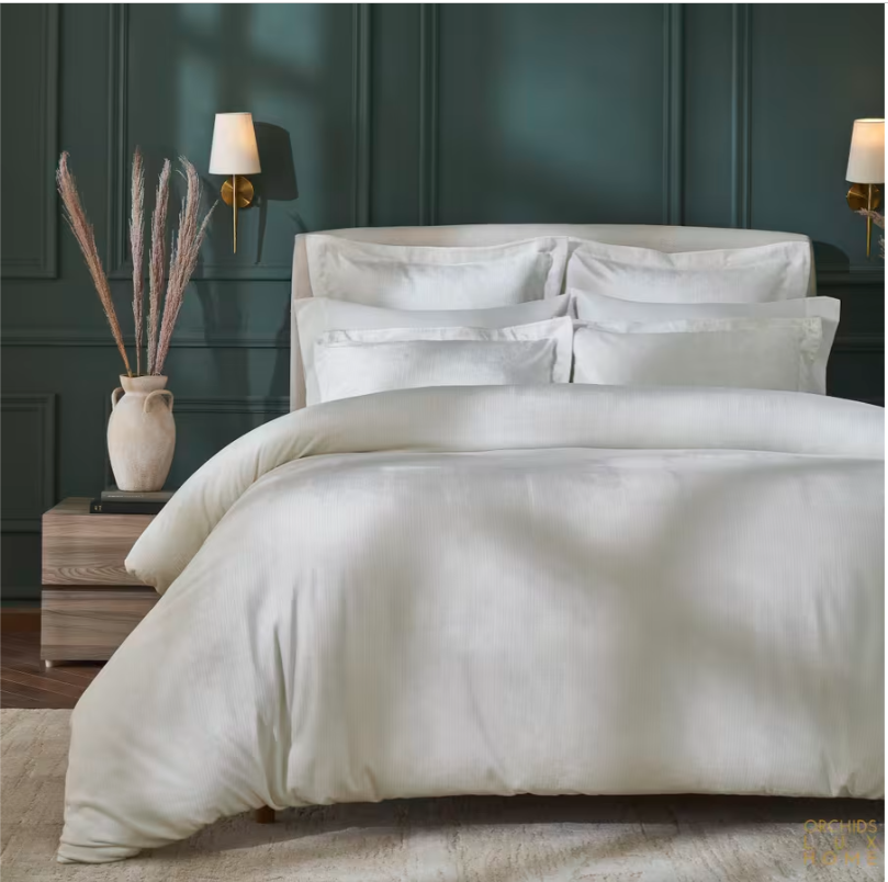 Elevate your bedroom with the refined glamour of the Orchids Lux Home Milano Channel Stitch Velvet Duvet Cover & Sham. Designed to make a statement, the front is crafted from a sumptuous blend of cotton and viscose velvet, detailed with elegant channel stitching that adds depth, texture, and a modern architectural feel. The velvet’s soft sheen and plush hand bring a sense of warmth and indulgence to your space.